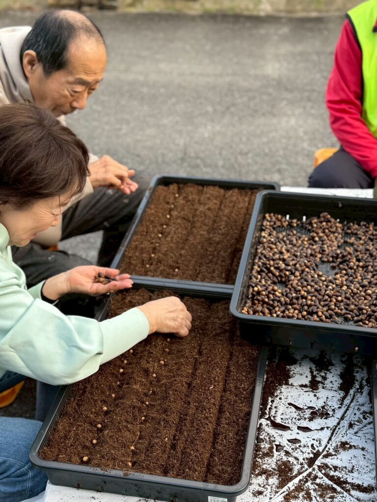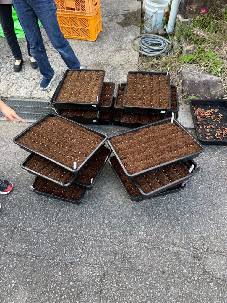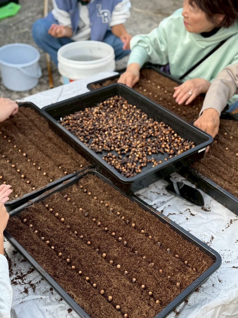 どんぐりを並べたトレイを各自持ち帰り、自宅で育てます。